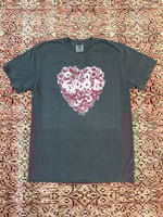 Front and back graphic printed in pink on pepper Comfort Colors tees at Edgemen Printing.