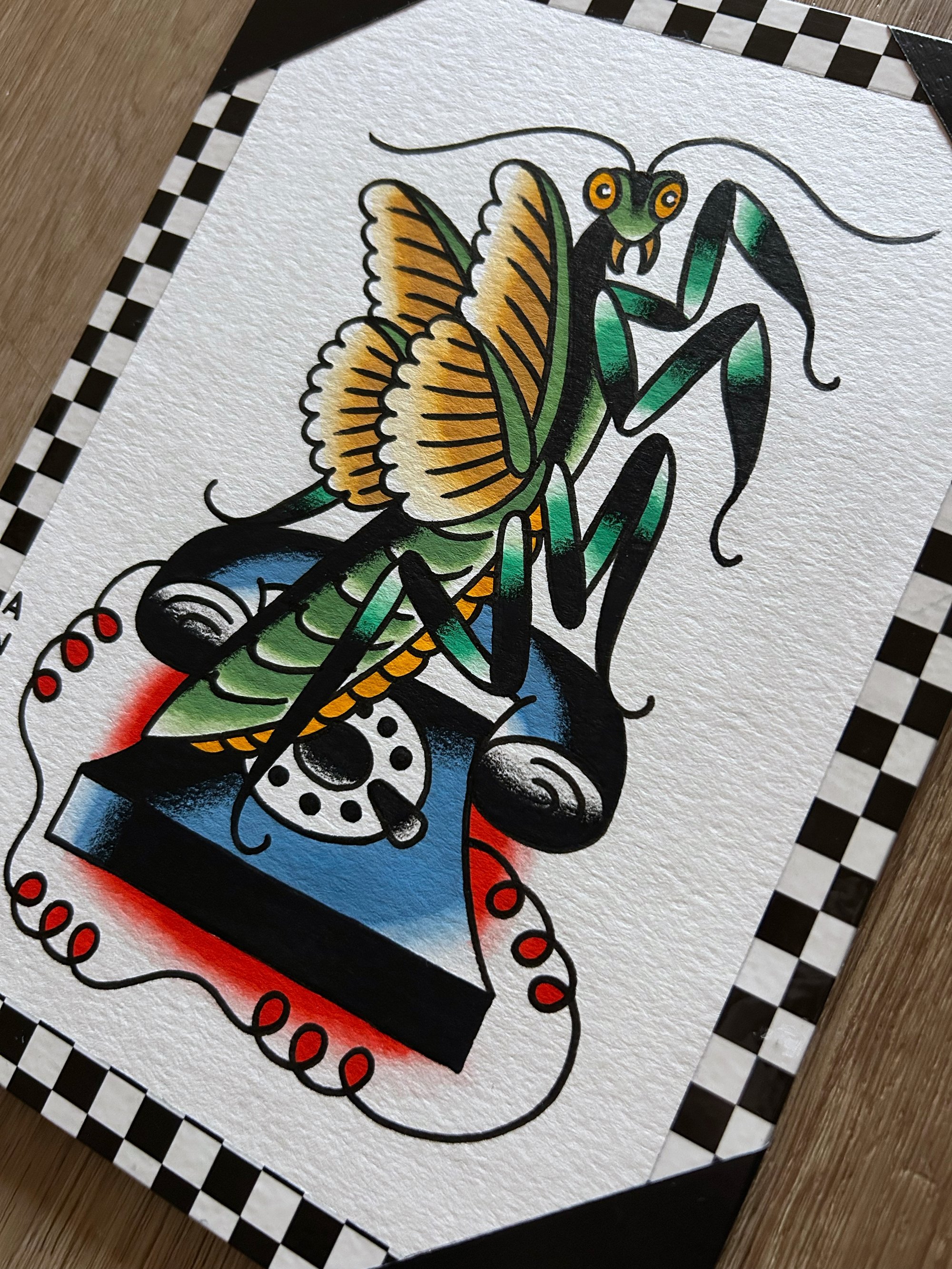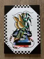 One-off original painting mounted on cardboard. Hardware is attached on backside for easy hanging.